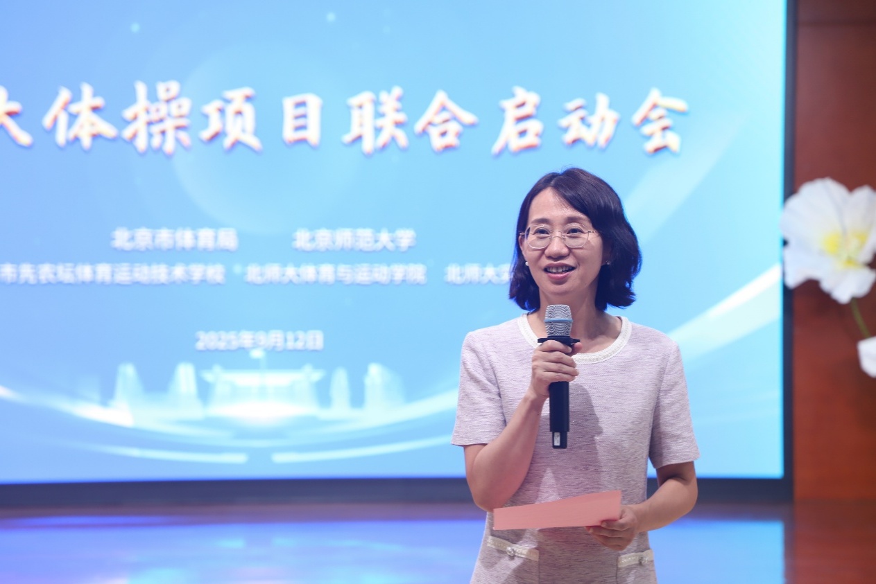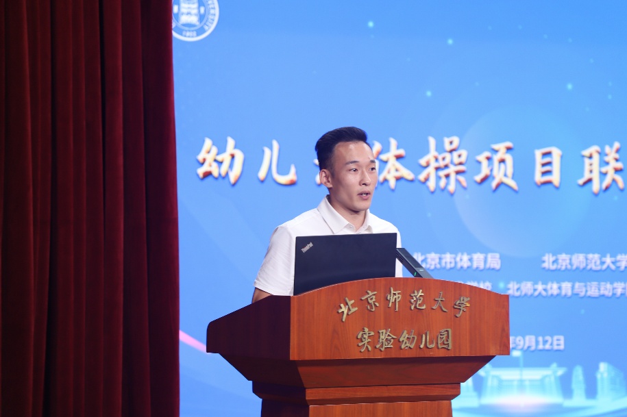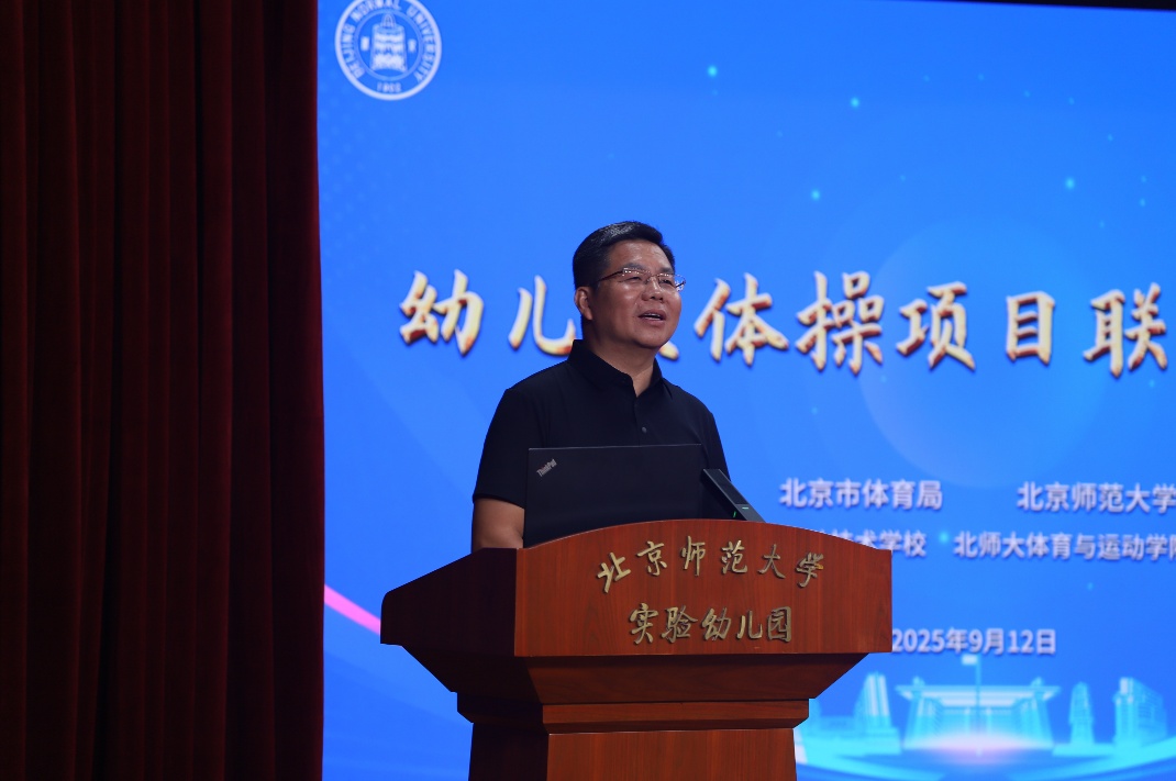 为通过大体操助力幼儿身心全面发展,9月12日下午,由北京市体育局与北京师范大学合作共建的幼儿大体操项目启动会在我园北楼多功能厅举行。北京市体育局二级巡视员陈雪松、北京市先农坛体育运动技术学校副校长肖若腾(体操世界冠军、国际级健将)、北京市体操队正高级教练员陈刚(体操国际级裁判员)等体育系统代表,我校体育与运动学院院长殷恒婵教授、基础教育发展管理部副部长田军等学校代表,以及我园党委书记杜军、园长夏华颖等幼儿园代表共同出席启动仪式。会议由夏华颖主持。