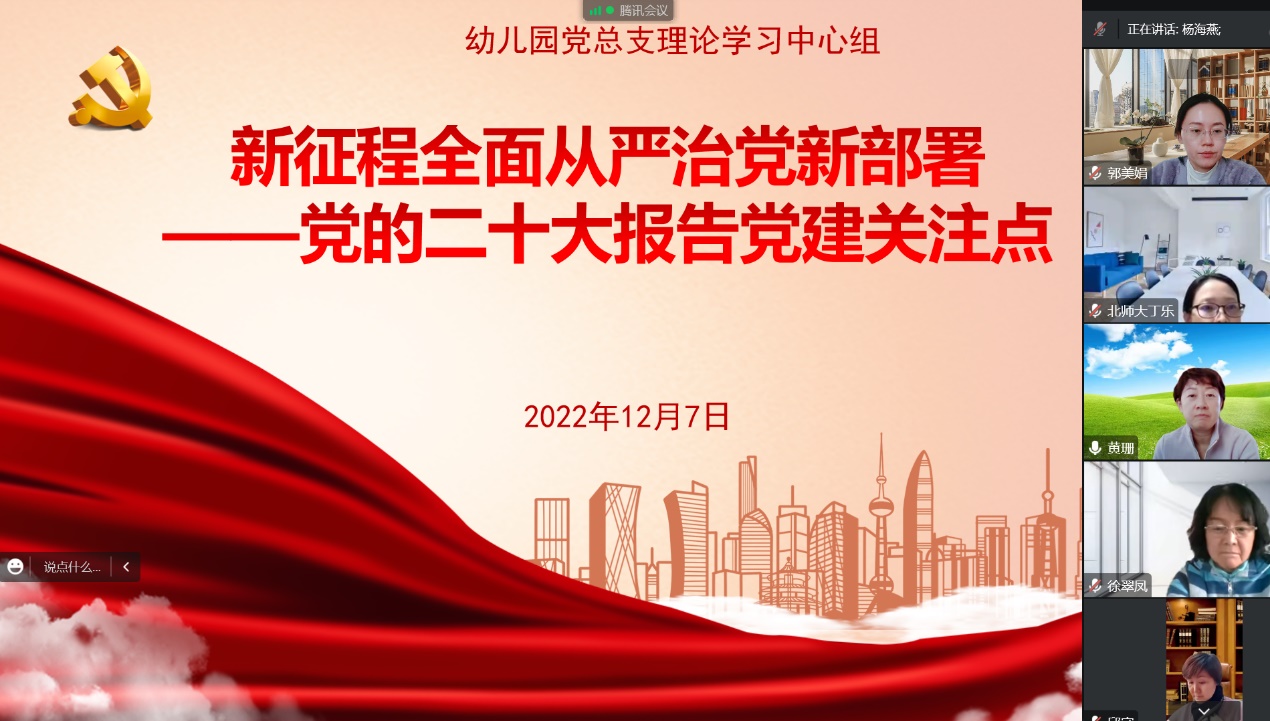 2022年12月7日,幼儿园党总支理论学习中心组开展集体学习,本次学习的专题是“坚定不移推进全面从严治党,持之以恒抓好意识形态工作”。党总支书记黄珊主持了学习会,党政班子全体成员参加,学习会采用线上会议方式进行。