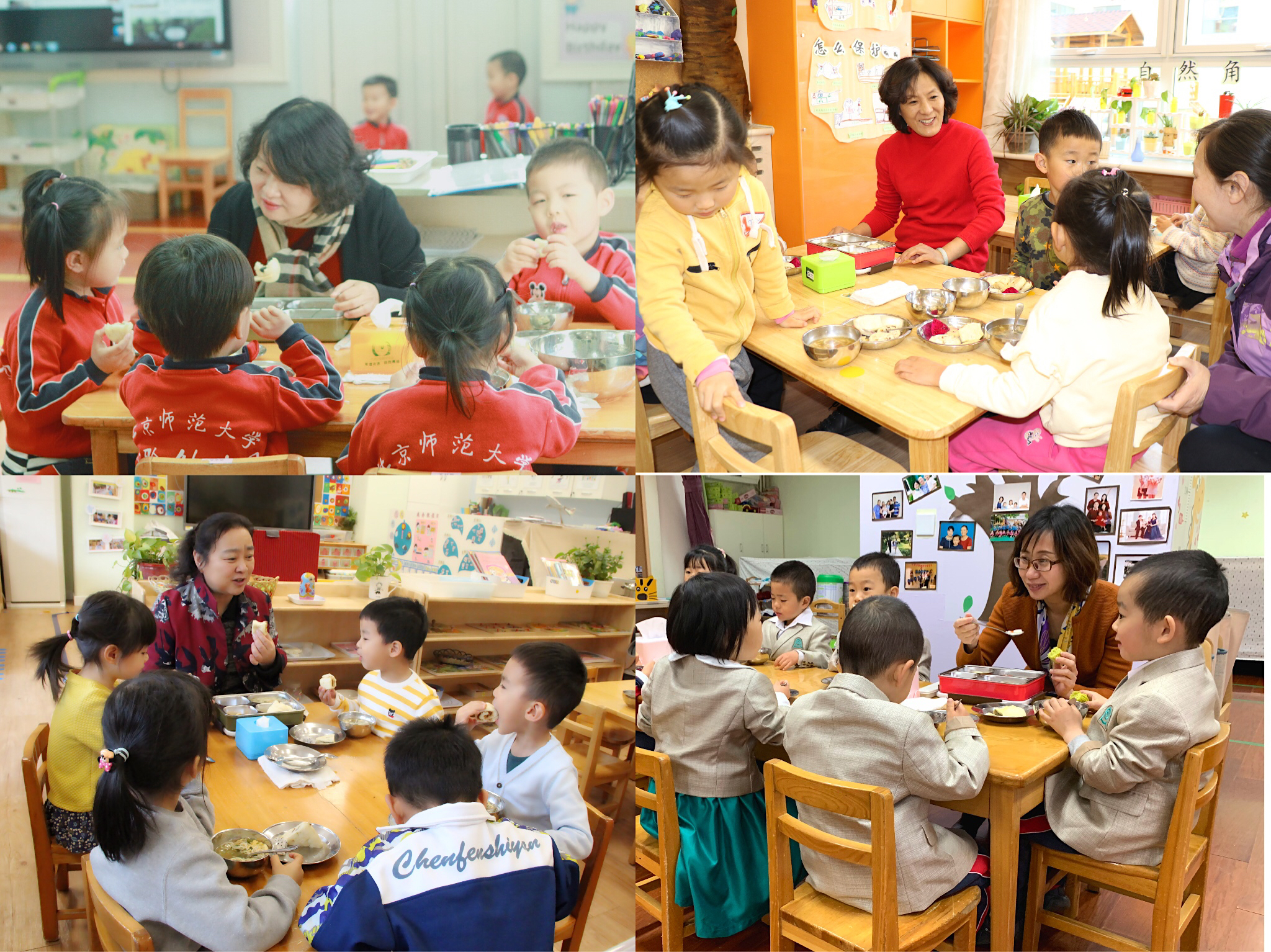 各园执行园长坐在小朋友中间,小朋友受到园长们的鼓励后,吃得更香了