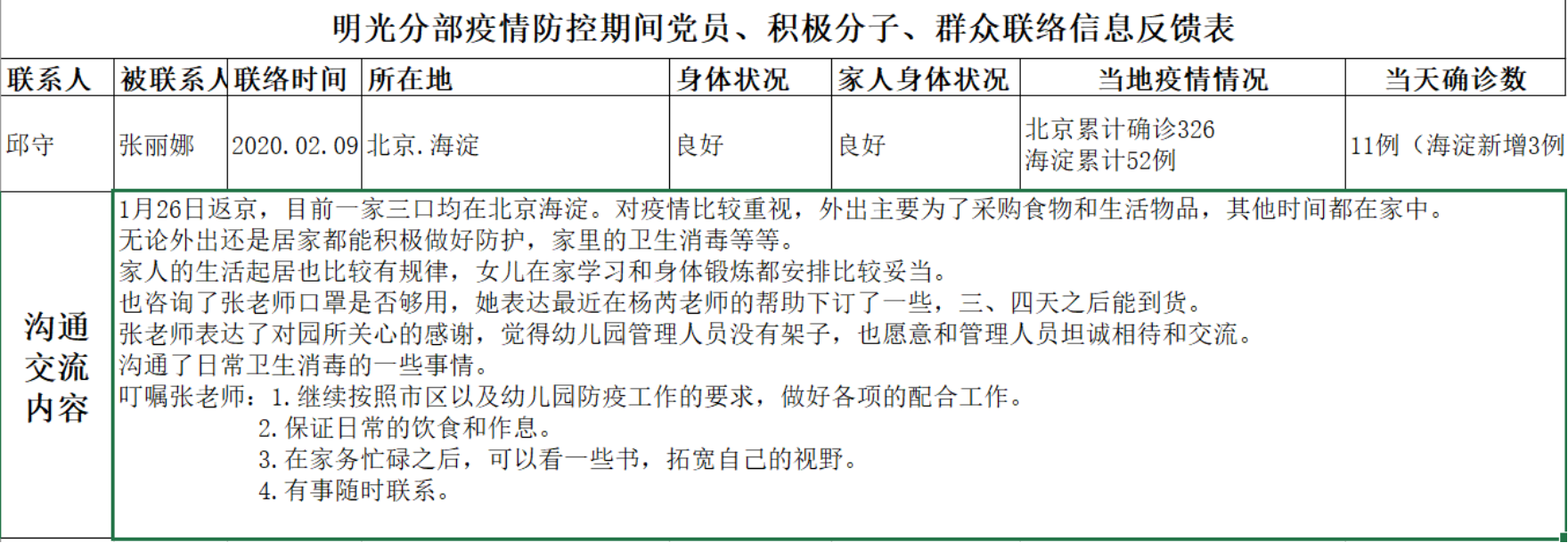 明光分部疫情防控小组工作记录表 |