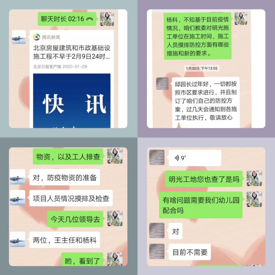 明光目前处于工程期,疫情对于工期也有一定影响。为做到心中有数,执行园长邱守和海淀区教委基建科科长、项目经理保持及时联系,及时了解相关政策和要求。2月8日,海淀区教委主任王方在基建科杨科长、项目经理的陪同下到明光工地进行工作检查,要求做好防疫物资、项目人员情况排查等工作。就此,执行园长邱守也和项目经理进行了细致的沟通,施工单位表示一定按照建委和教委的要求做好落实。