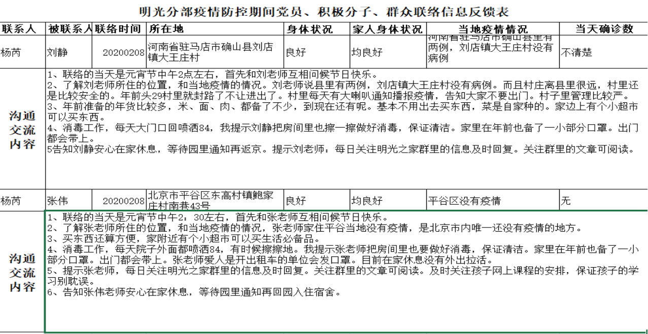 明光分部管理人员时时关注时况,并心系明光教职工,执行园长邱守在2月4日、2月8日分别和总务主任杨芮、保教主任王晓晔一起,同后勤人员、一线教师进行远程视频慰问,了解大家和家人的身体状况、居家生活情况、防疫措施、生活物资购买等。同时,结合总部倡议,明光启动4名党员和4名积极分子牵手联络,同时11名党员、干部、积极分子和17名群众牵手联络,做到隔离不隔心,空间有距离,关爱没有距离。结对联络、多形式沟通,这个特殊的春节让滚球app的心走的更近。
