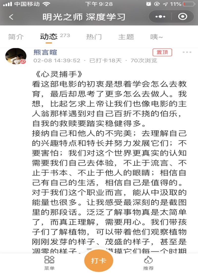 看电影悟人生,让优秀的电影滋养教师心灵,明光分部执行园长邱守为全体教职工以及教师团队有针对性地推荐多部经典电影。教师团队通过观看电影,分享感受,进一步感知教育的价值与教师的责任。