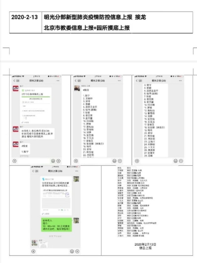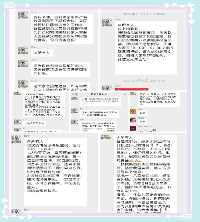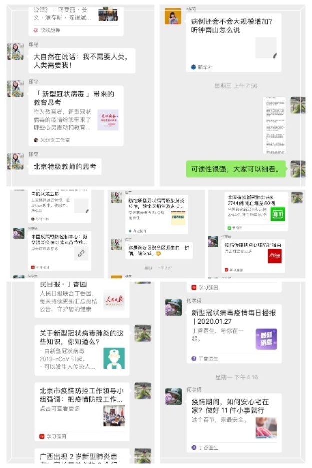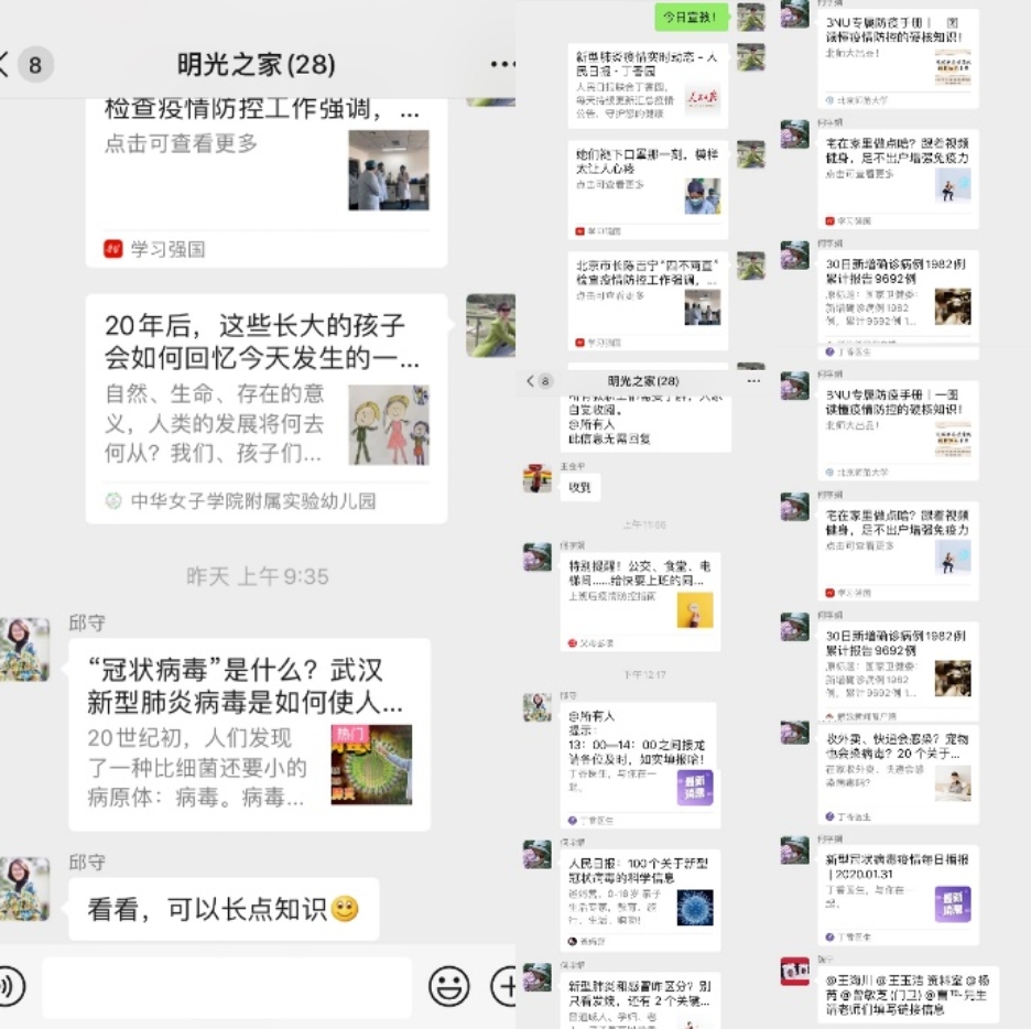 从1月27日至今,“明光之家”教职工群发布了来自学习强国APP、人民日报、新浪新闻、海淀教育、朱继文工作室、北京师范大学公众号、丁香医生公众号等10多家权威多媒体,关于新型冠状病毒科普、疫情实况、防护、辟谣等相关文章和视频总计百余篇。