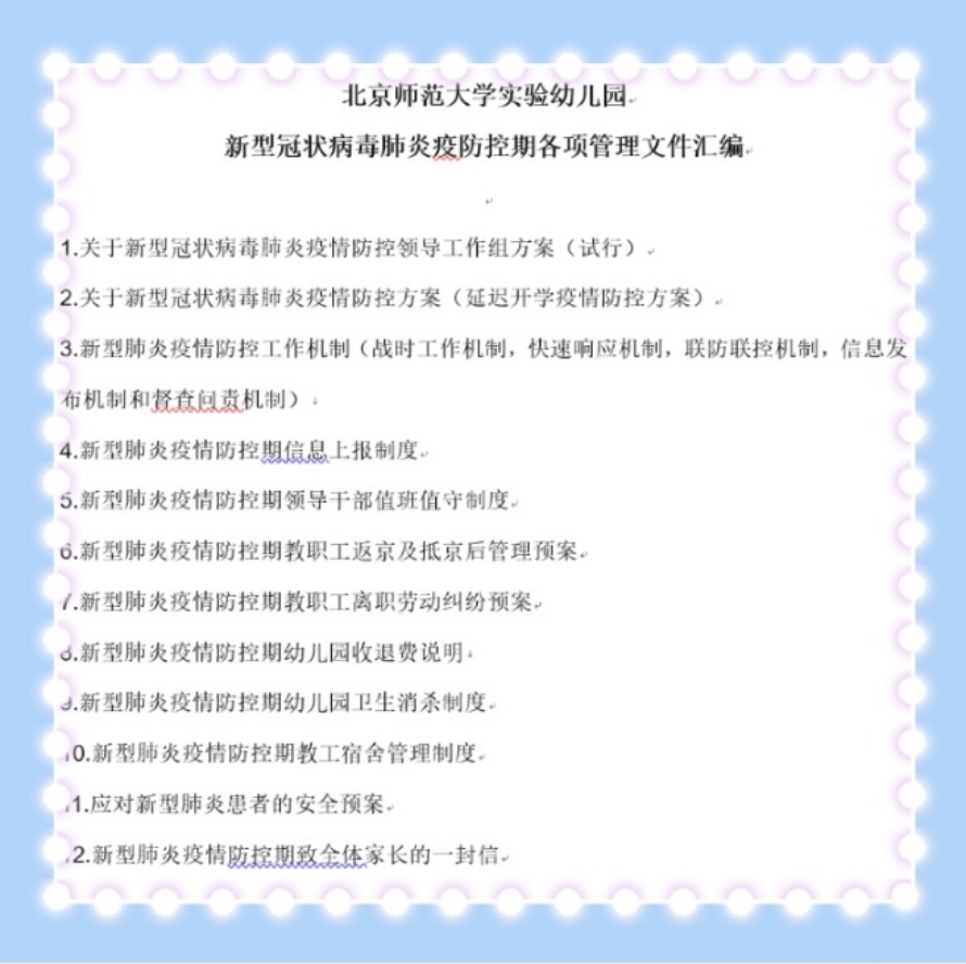 明光疫情防控小组共计10人(含机动人员),防控小组通过学习正规滚球app官方网站制定的“疫情防控方案”和“疫情防控领导工作组方案”两个文件(试行),召开防控小组视频会议,传达黄珊总园长参加教委会议的相关精神,布置防控小组成员职责与值班安排的工作。