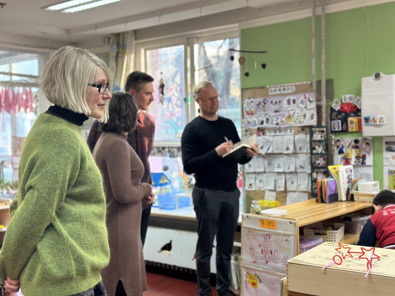 园所文化主题参访活动丰富多彩,《蒙养百年 倡导开新》-- 关于幼儿园百年园史与当前教育改革实践的专题介绍,全方位展现了幼儿园的百余年来的传承与发展。幼儿园文化墙解读环节引人入胜,其内涵与创意设计生动诠释了 “以儿童为本” 的教育理念,让芬兰师生身临其境地感受百年实幼的教育魅力。