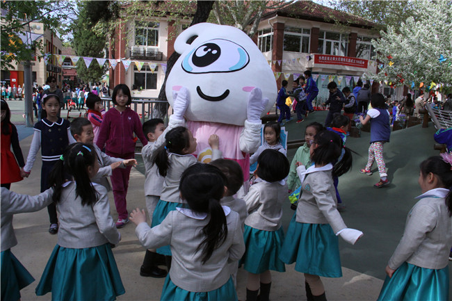 校友和幼儿园小朋友与园庆吉祥物妙妙做游戏