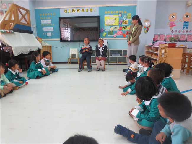 在园小朋友向校友姐姐介绍园庆吉祥物奇奇