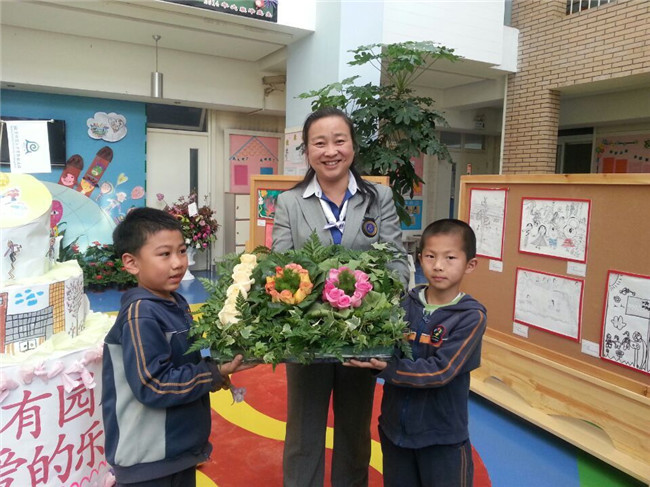 毕业生代表来看望园长,送来亲手制作的鲜花,祝幼儿园100岁生日快乐。