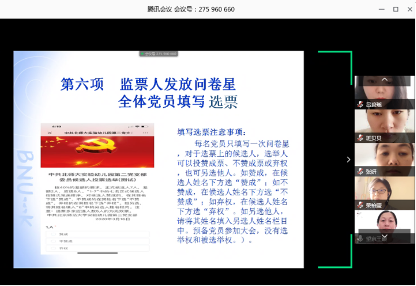 3月16日、17日,幼儿园第二党支部和第一党支部分别召开了“特殊”的支部委员选举大会,考虑目前处于疫情防控的特殊时期,会议采用网络线上视频的形式,两个支部共56名党员全部参会。大会严格按照选举的有关规定和程序,在充分酝酿支部委员会候选人名单的基础上,与会党员举手表决通过了选举办法及监票人、计票人名单,以无记名网络投票、差额选举方式选举产生了第一届委员:由杜军、吴迪、邱守、滕瑾、鞠亮5位同志组成第一支部委员会;由吴媛媛、杨海燕、徐翠凤、夏华颖、黄宇佳5位同志组成第二支部委员会。
