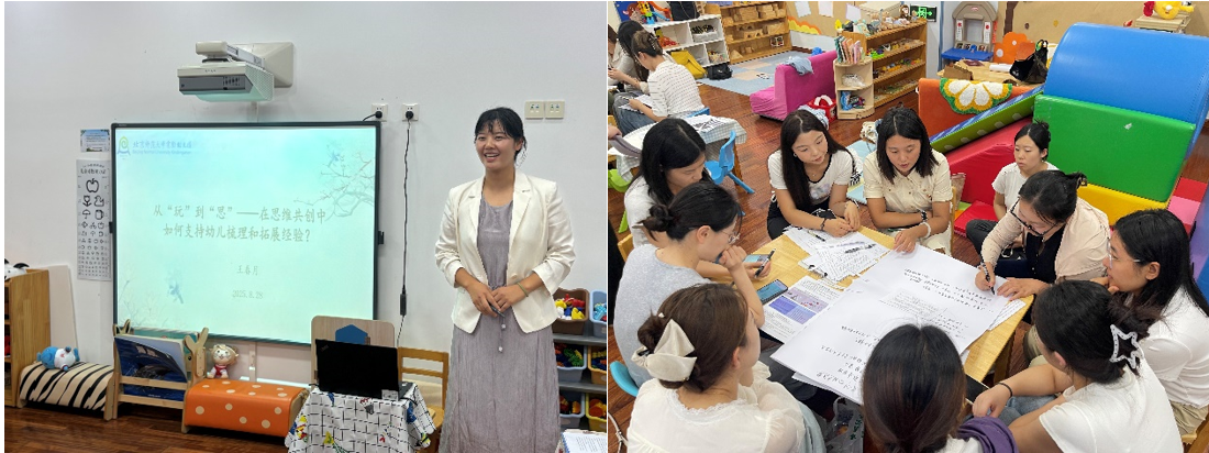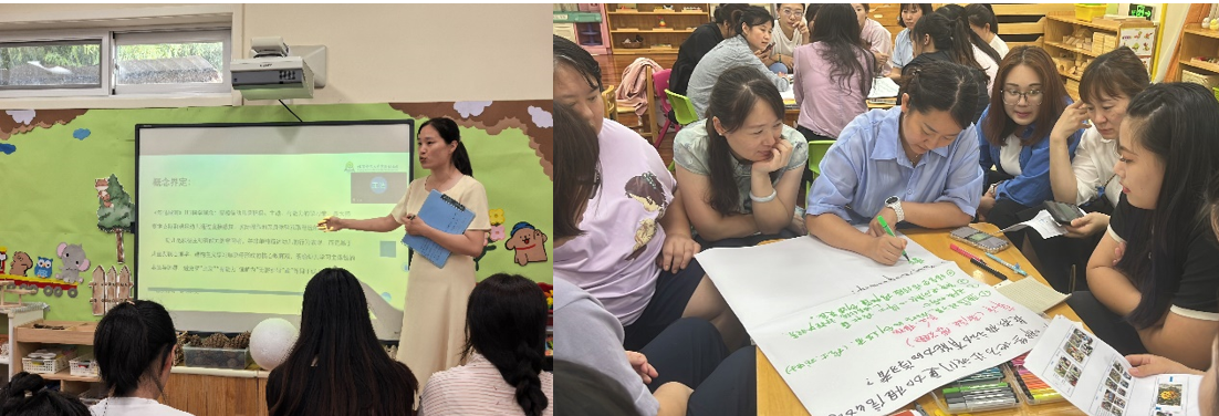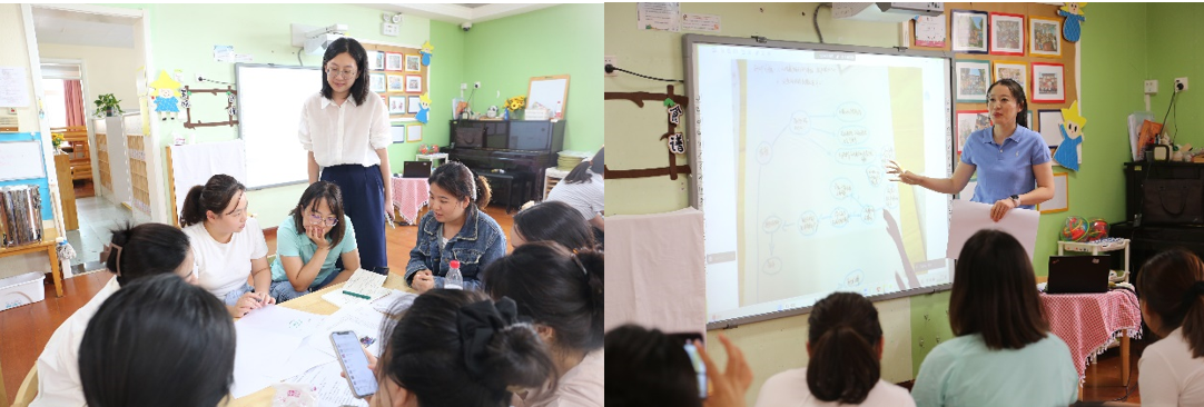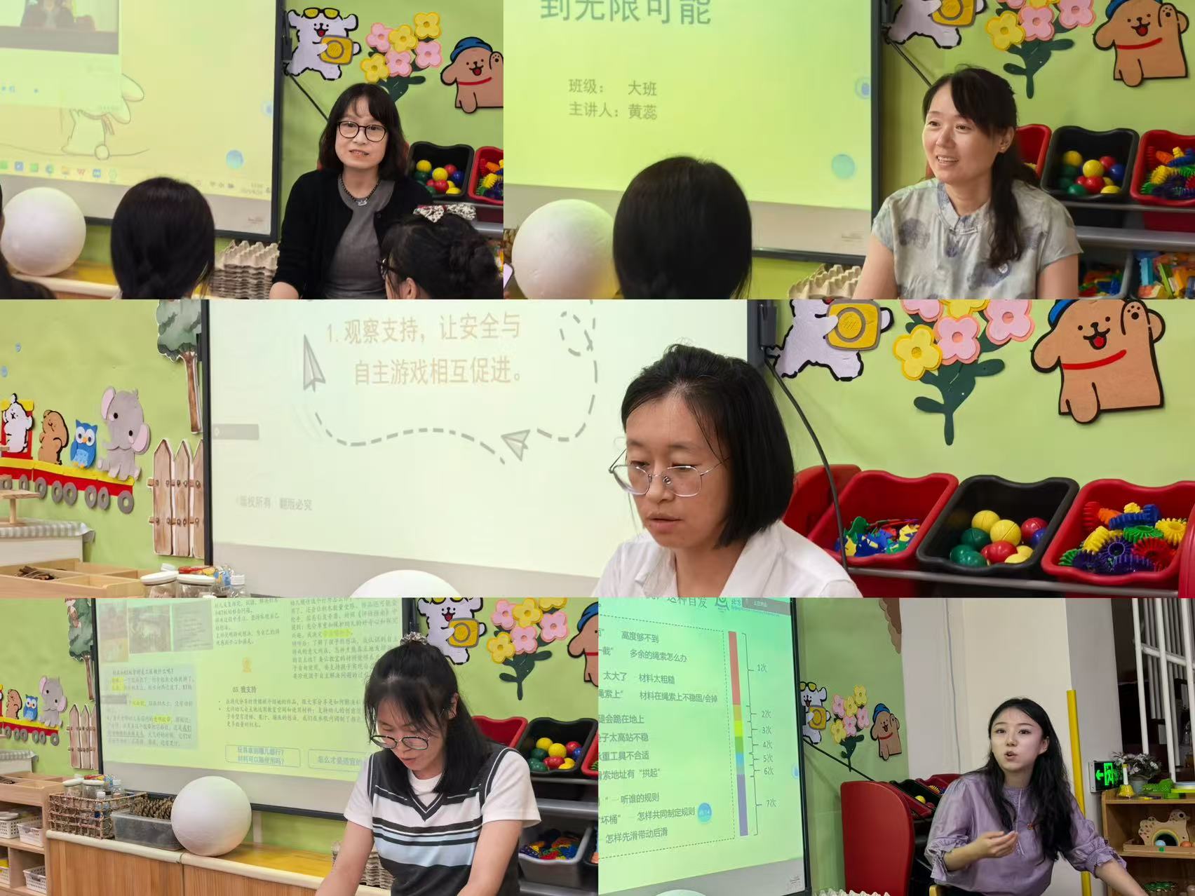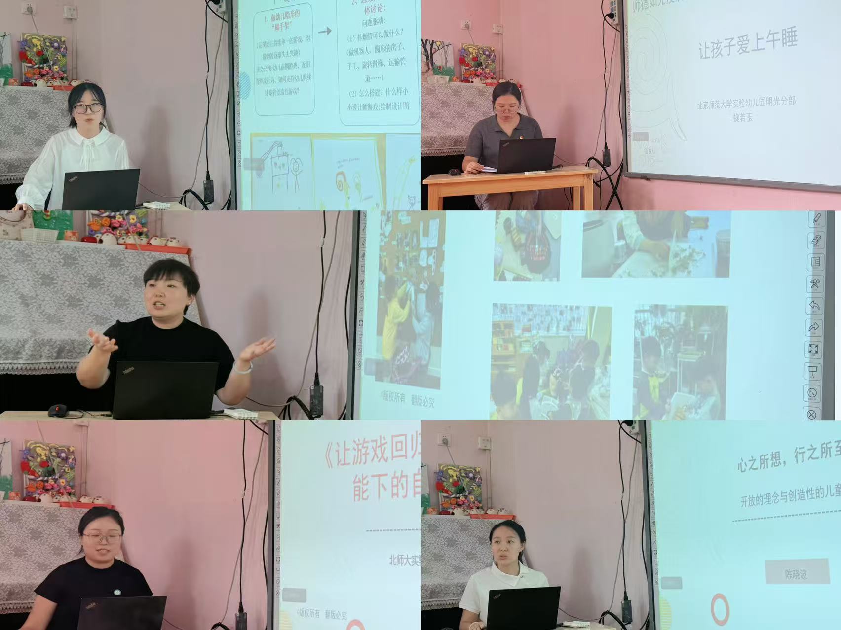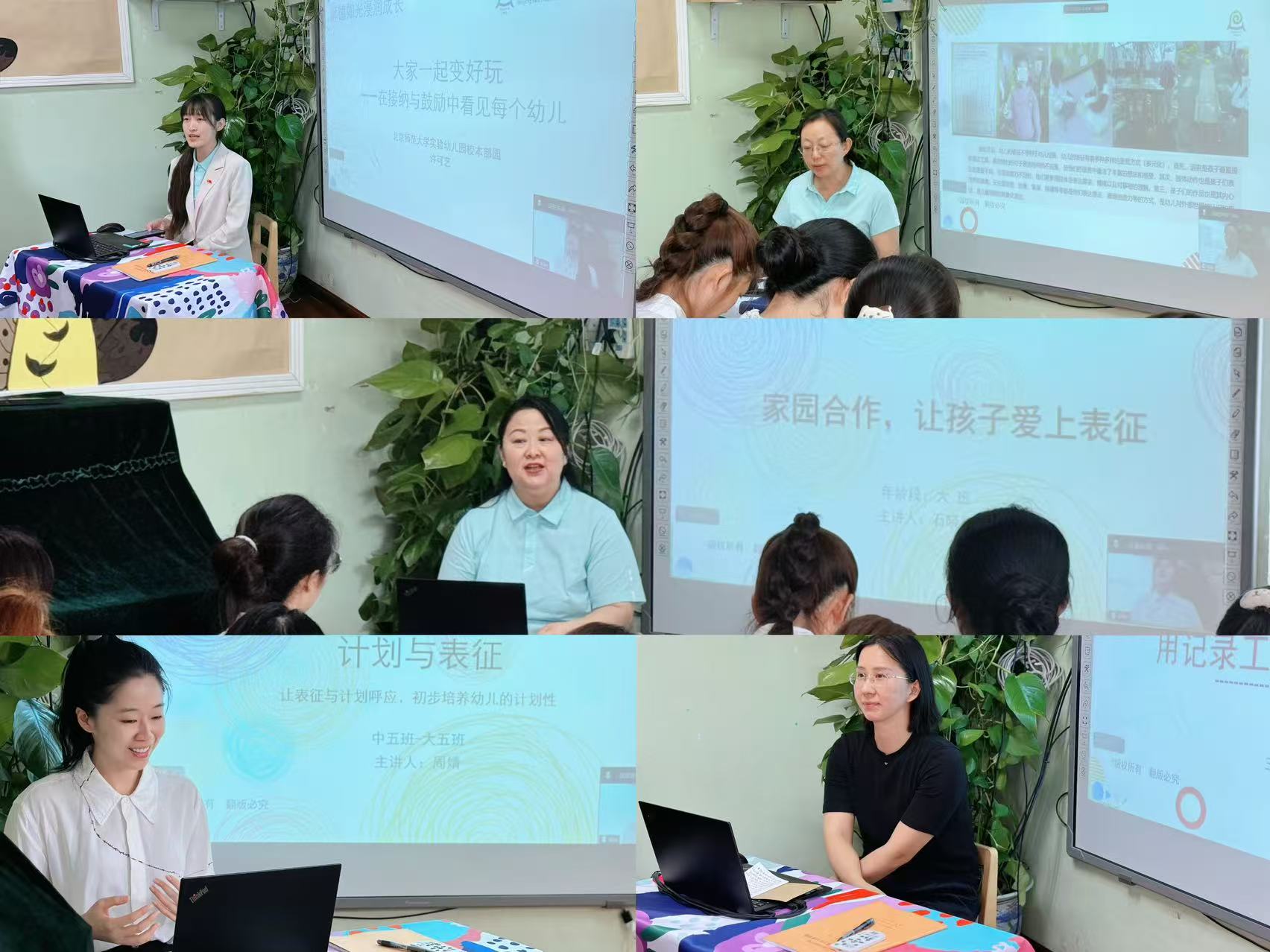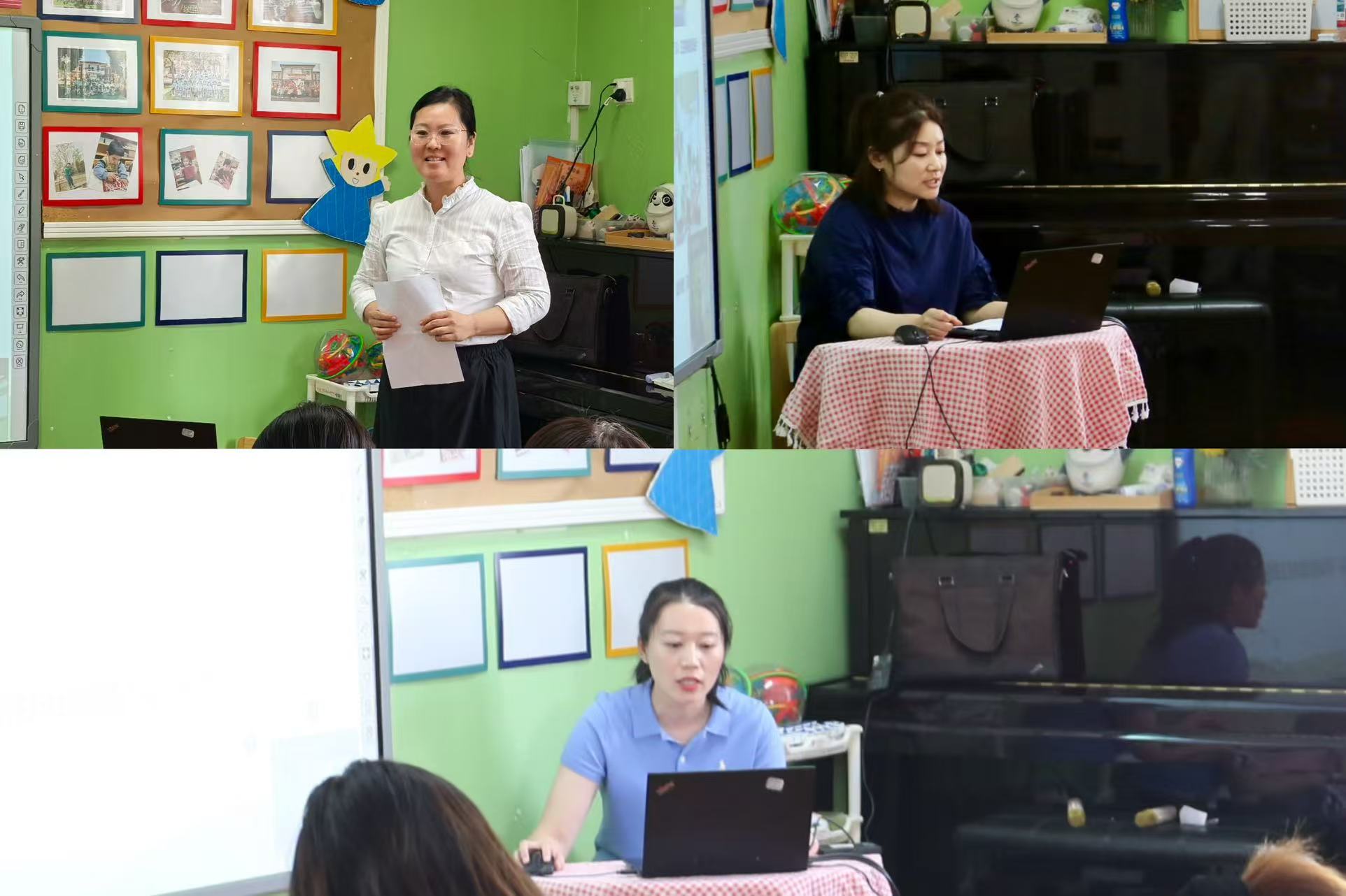 本部分包含“表征与倾听”“相信与成长”“从‘玩’到‘思’”“捕捉游戏生长点”“托班专题分享”五大专题,聚焦教育理念的深化落地与特殊教育场景的适配,着力解决“如何让教育更贴合幼儿需求、更具温度与针对性”的问题。校本部园教研主任李琳主持的“表征与倾听”专题,通过师德故事分享与“我的假期”表征实践,引导教师尊重幼儿多元表达、倾听真实需求,同时关联家园共育;牡丹分园保教主任赵庆楠带领的“相信与成长”专题,针对教师认知与实践脱节的困惑,以案例引导强化“幼儿是积极、主动、有能力学习者”的信念;未来一幼保教主任王春月主导的“从‘玩’到‘思’”专题,通过 Bingo 游戏教学、头脑风暴等形式,帮助教师掌握思维共创方法,支持幼儿梳理与拓展经验;新校区园教研主任田蕊敏主持的 “捕捉游戏生长点” 专题,以“案例析策略、现象抽规律”的模式提升教师支持幼儿深度学习的能力,还融入正念冥想环节体现人文关怀;金菁带领的“托班专题分享”,则针对托班幼儿特殊性,从情绪安抚、家园共育、常规建立等维度提供专项指导,为托班开班保驾护航。五大专题既深化了以儿童为中心的教育理念,又兼顾了不同发展阶段幼儿(如托班)的特殊需求,让教育实践更具针对性与温度。
