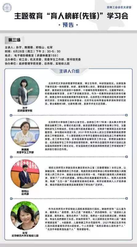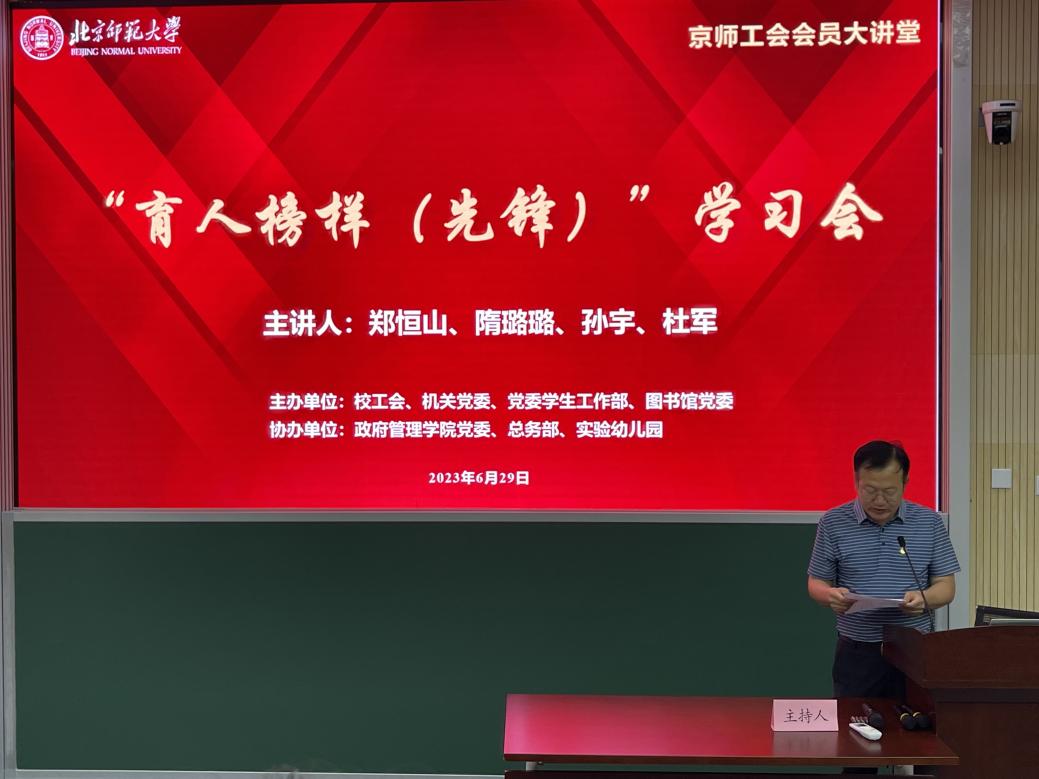 为弘扬先进,激励广大教职工学习先进、争当先进,推进“双一流”、建功新时代,深化推进主题教育走深走实,2023年6月29日,北京市教育系统“服务育人先锋”荣誉称号获得者校本部园执行园长杜军,受邀参加由校工会、机关党委、党委学生工作部、图书馆党委联合举办的主题教育“育人榜样(先锋)”学习会,杜军园长做“育人为本,用心服务”的主题教育报告,我园29位教师现场聆听讲座。