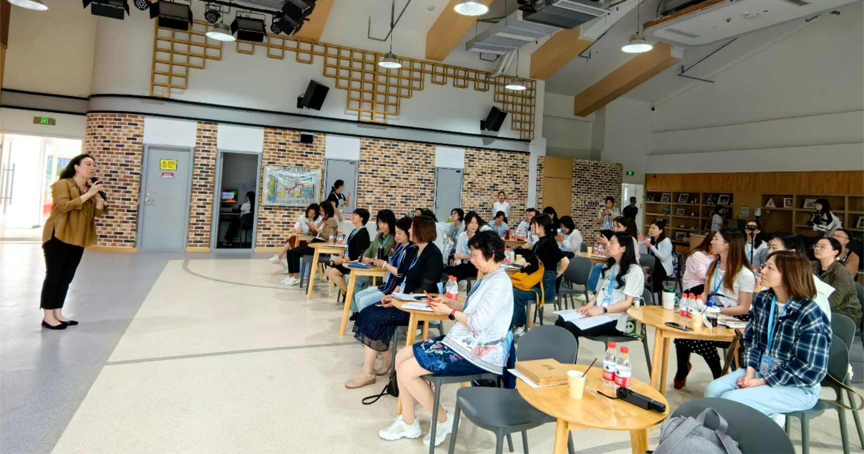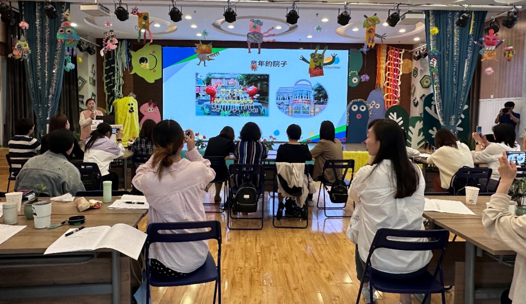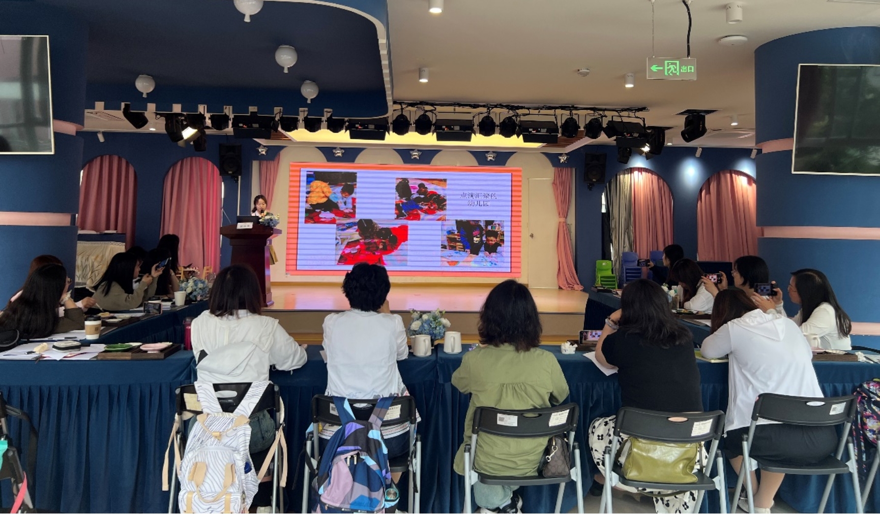 在多功能厅,从业务园长、主任及教师的分享中全方位了解该园的课程理念与实践。业务园长蔡欣以《构建贴近儿童经验的园本课程》为题分享了红幼“阅历”课程的文化脉络、课程内容、成效与发展方向。任琇主任聚焦《园本课程的班本化实践》,介绍如何在园本课程框架下灵活地开展班本化教学活动。在此基础上,红幼教师以生动的教学展示及课程案例分享将研学团队带入实际的教学情境中,包括大班现场语言活动《四海八荒》、中班课程故事《梦》和小班课程故事《我看幼儿园》。
