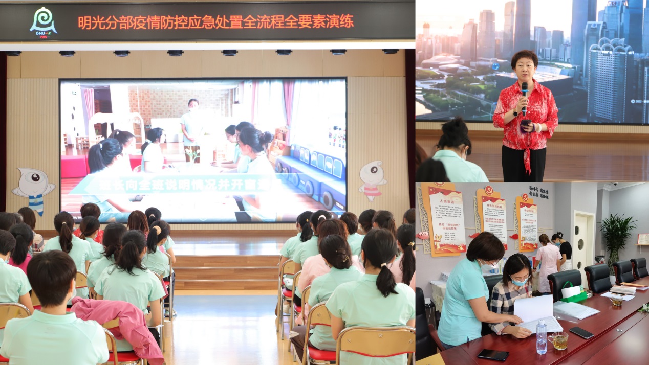 根据市区教工委关于基础教育系统疫情防控工作会议的精神,为了提升幼儿园疫情防控管理水平,为了强化应急队伍建设和提高疫情防控应急处置能力, 2022年9月下旬,正规滚球app官方网站八个园所分别组织了全流程、全要素的疫情防控应急演练,重点演练突发疫情应急处置的程序、方法、内容、渠道和措施等。黄珊总园长先后前往各园检查疫情防控应急演练的有关工作,包括查档案、看现场、听复盘等,并根据园所的实际提出了具体的指导意见和建议。此外,她还实地了解并检查了食品、消防、校园周边等安全情况。