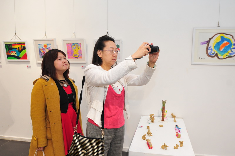 参加国际研讨会的嘉宾参观“百年有园”幼儿美术作品展