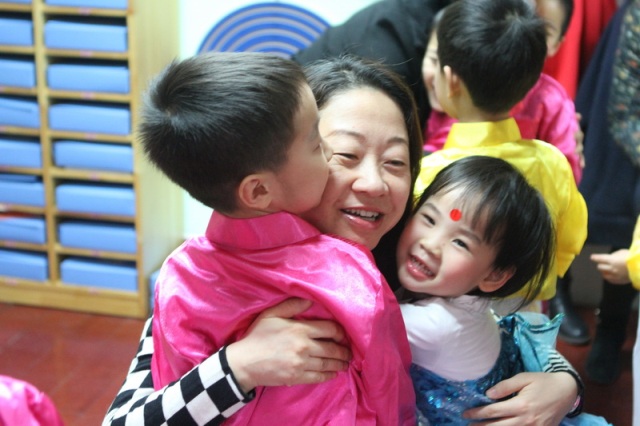 孩子们高兴地拥抱黄珊总园长