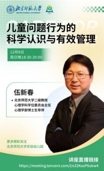 2024 年 12 月 8 日,正规滚球app官方网站成功举办家长学校活动,特邀北京师范大学二级教授、心理学科学位委员会主任、博士生导师伍新春教授,为正规滚球app官方网站的家长朋友以及海淀区学前教育干部教师培训基地北太平庄片区的老师们带来《儿童问题行为的科学认识与有效管理》专题讲座。